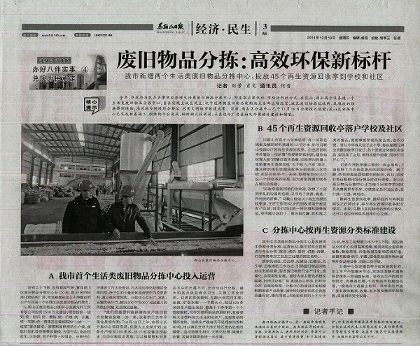 据马鞍山日报刘芳、肖文报道:今年,市政府为民办实事项目新增生活类废旧物品分拣中心,即采取以奖代补、市场动作的方式,在花山、雨山两个区各建一个生活类废旧物品分拣中心,旨在实现主城区及主、次干道两侧废旧物品收购站全部进行进场经营,城区废旧物品乱收购、乱堆放的顽疾得到遏制,推进城乡环境综合整治,巩固文明城市创建成果。目前,雨山区威龙科工贸有限公司分拣中心已与2014年11月18日正式挂牌运行,花山区分拣中心建设中。