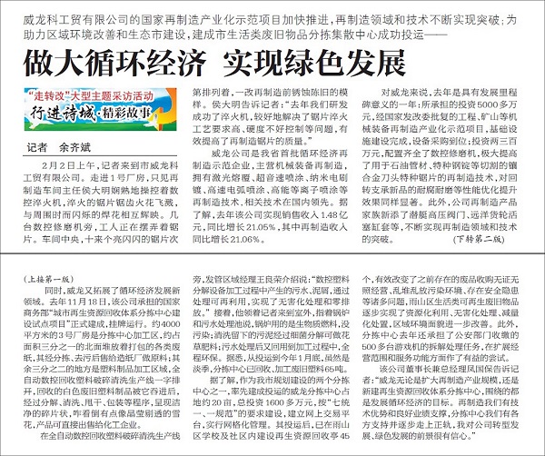 2015年2月2日马鞍山日报社记者余齐斌,关于威龙公司“做大循环经济,实现绿色发展”的专题报道
