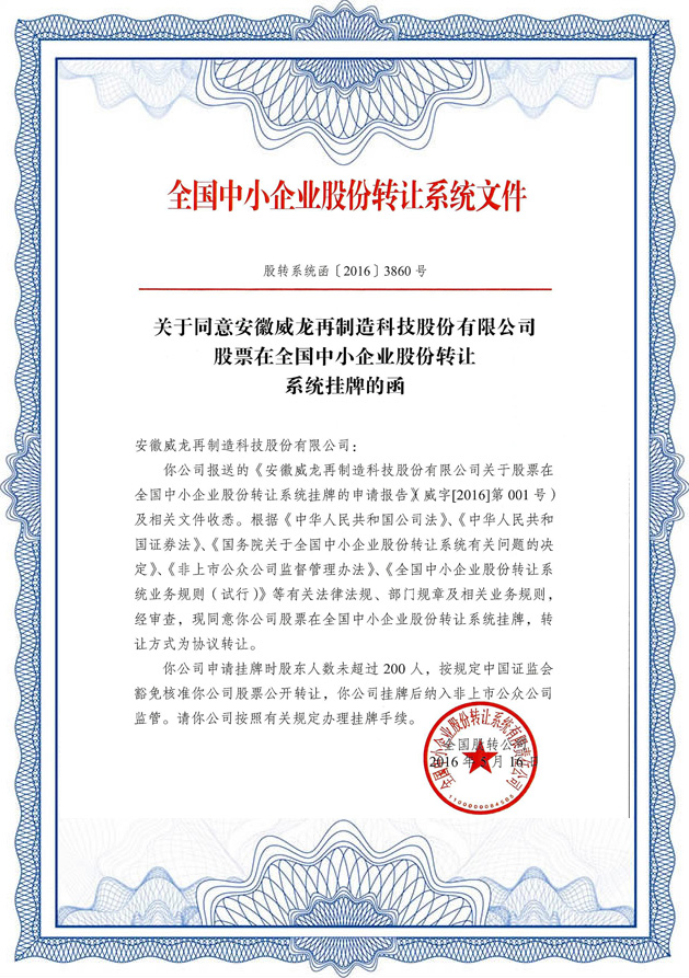 热烈祝贺安徽威龙再制造科技股份有限公司新三板挂牌上市