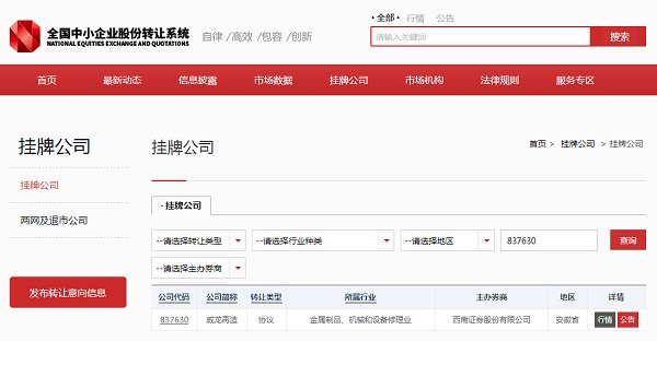 输入威龙再造股票代码:“837630”点击“查询”即可!